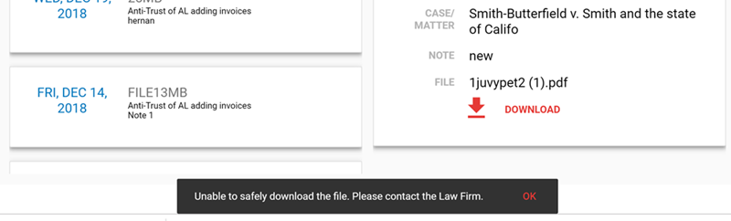 Before the client downloads a document, it is scanned for malicious software. If the file fails the malware check, the download is canceled and the client receives the following message: