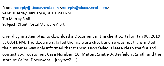An email that includes the client name and the document name is automatically sent to the associated attorney. For example: