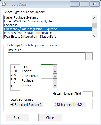Under Equitrac Format, select the format your data is in. With Standard System 3, all data is stored in one import file. With Disbursement 4.2, you must import each type of transaction separately, so that if you recover all 5 types of costs you will be importing 5 times, once for each type.