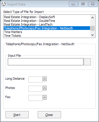 For Select Type of File for Import, select Telephone/Photocopy/Fax Integration - NetSouth.