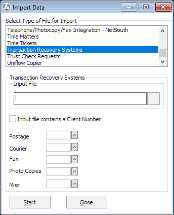 For Select Type of File for Import, select Transaction Recovery Systems.