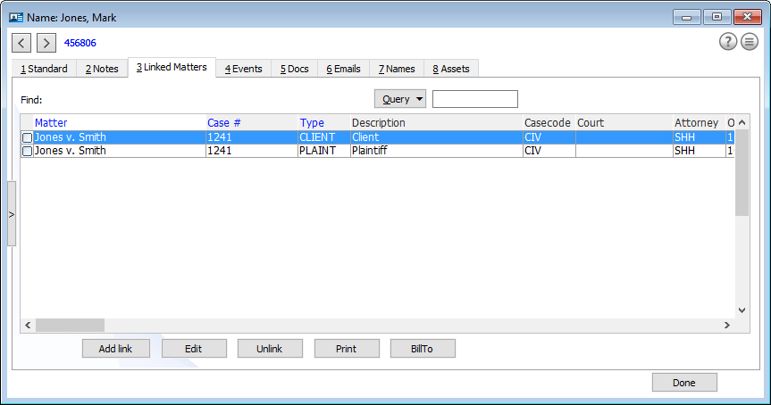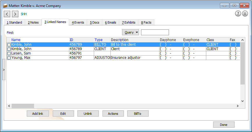 Names linked to matters are listed on the Matter window's Linked Names tab.